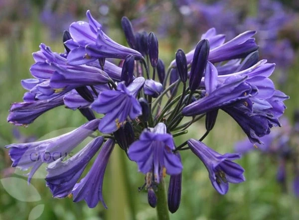 Globes of deep blue-black, trumpet-shaped flowers burst from almost black buds in July and August above semi-evergreen, strap-like leaves. This stunning African lily is perfect for the middle of a sunny, moist but well-drained border or a large patio pot. Although hardier than other varieties, in cold, exposed areas container-grown specimens will benefit from a deep, dry winter mulch.