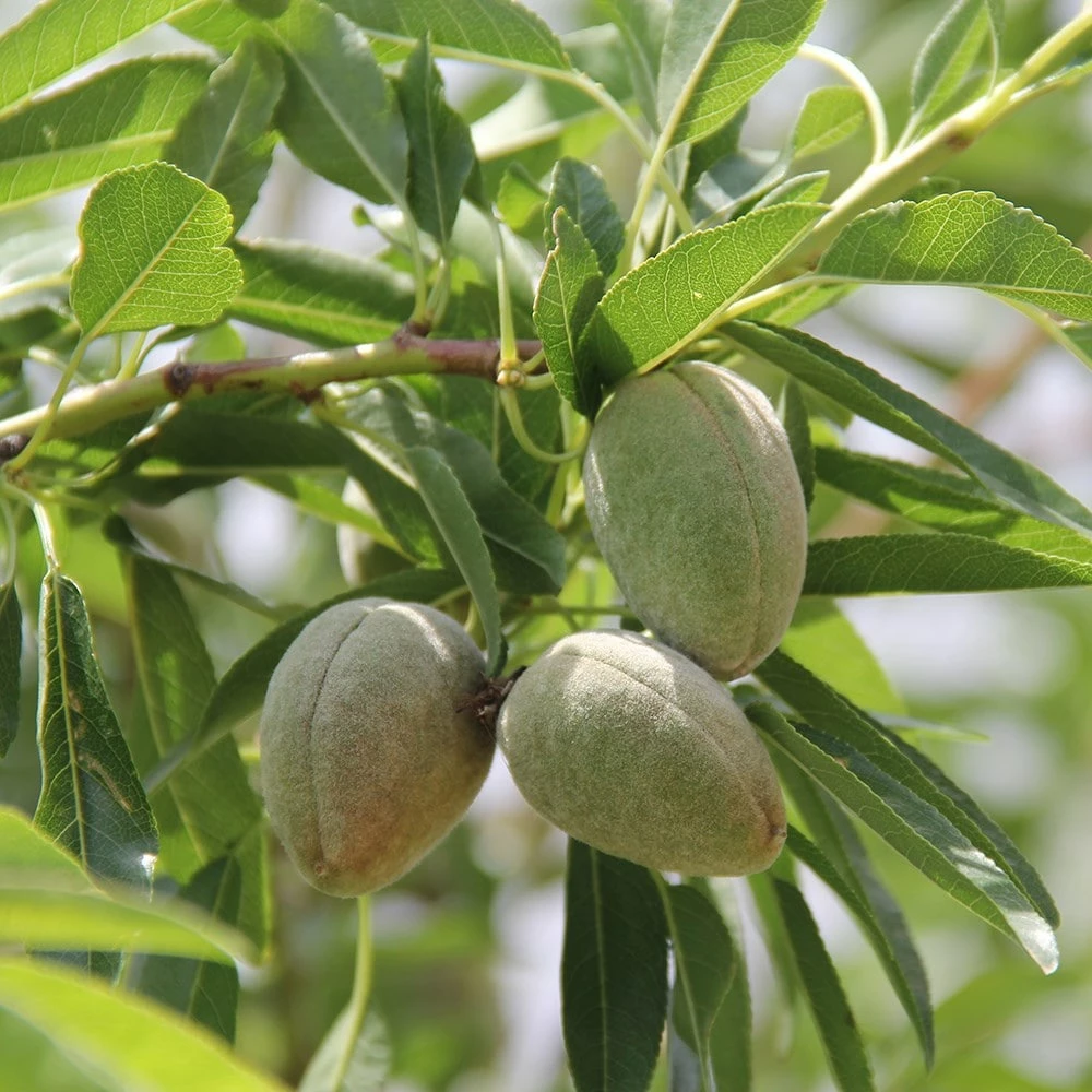 With soft shelled, very sweet tasting nuts, ‘Robijn’ is a standout, pinkish-white blossomed almond partially resistant to frost thanks to its late flowering. Having excellent resistance to leaf curl, the nuts develop within velvety fruits and will crop in a sunny, sheltered position in late summer to make almond milk, oil, butter, flour or paste.