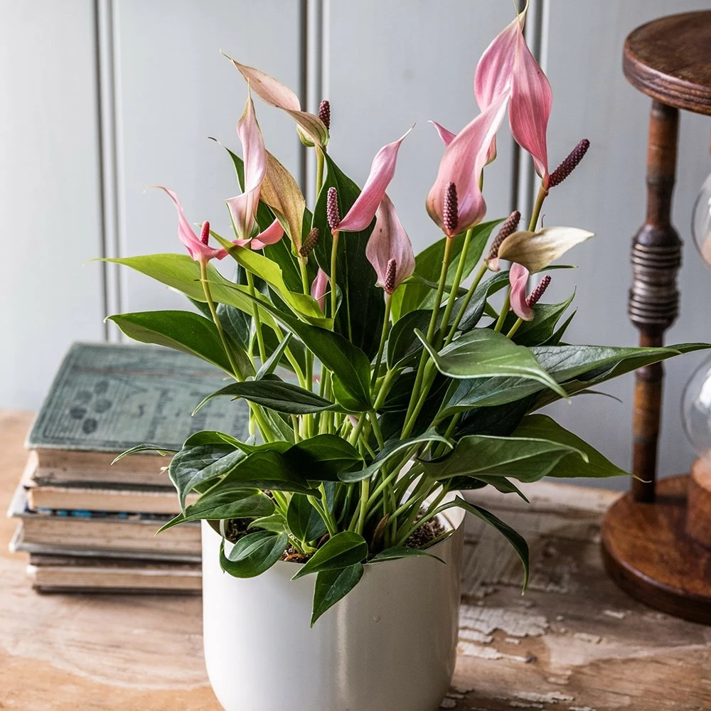 An unusual alternative to the peace lily, ‘Champion Lilli’ produces elegant and long-lasting, pink-flushed flowers, which rise above its slender, glossy green foliage. Choose a white plant pot cover and position in front of a white wall for a great statement – or for a stunning display, combine it with Aglaonema ‘Crete’.