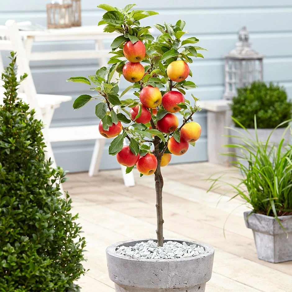 An intensely flavoured, honeyed and crisp cultivar that produces heavy, regular crops of apples; greenish-yellow flushed red. A cross between ‘Golden Delicious’ and ‘Ingrid Marie’, ‘Elstar’ is a dessert apple in pollination group 3, requiring a pollination partner of a different variety nearby, such as ‘Braeburn’ or ‘Cox’s Orange Pippin’. Sold as a mini-standard, which is currently approximately 80cm tall, it is perfect for pots.