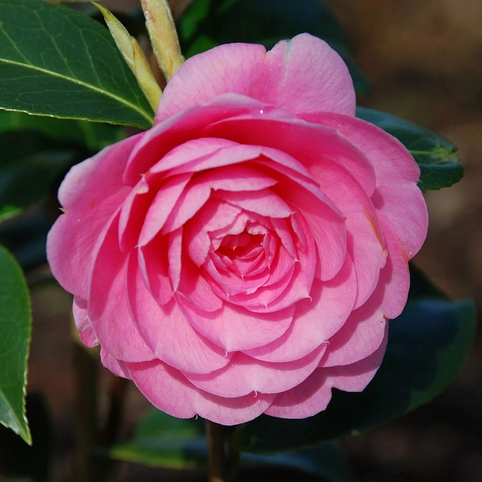 An upright, narrow shrub blooming with abundant pale pink formal double flowers in early spring. The gorgeous blooms emerge a paler pink before darkening to a delicate fuchsia hue, eventually reaching 10cm (4in) wide when fully open. Tightly packed petals create a rose-like flower form that pop against the dark green, slightly matt foliage. Hardy and vigorous, ‘E.G. Waterhouse’ has a columnar habit perfect for compact spaces and suitably large pots.