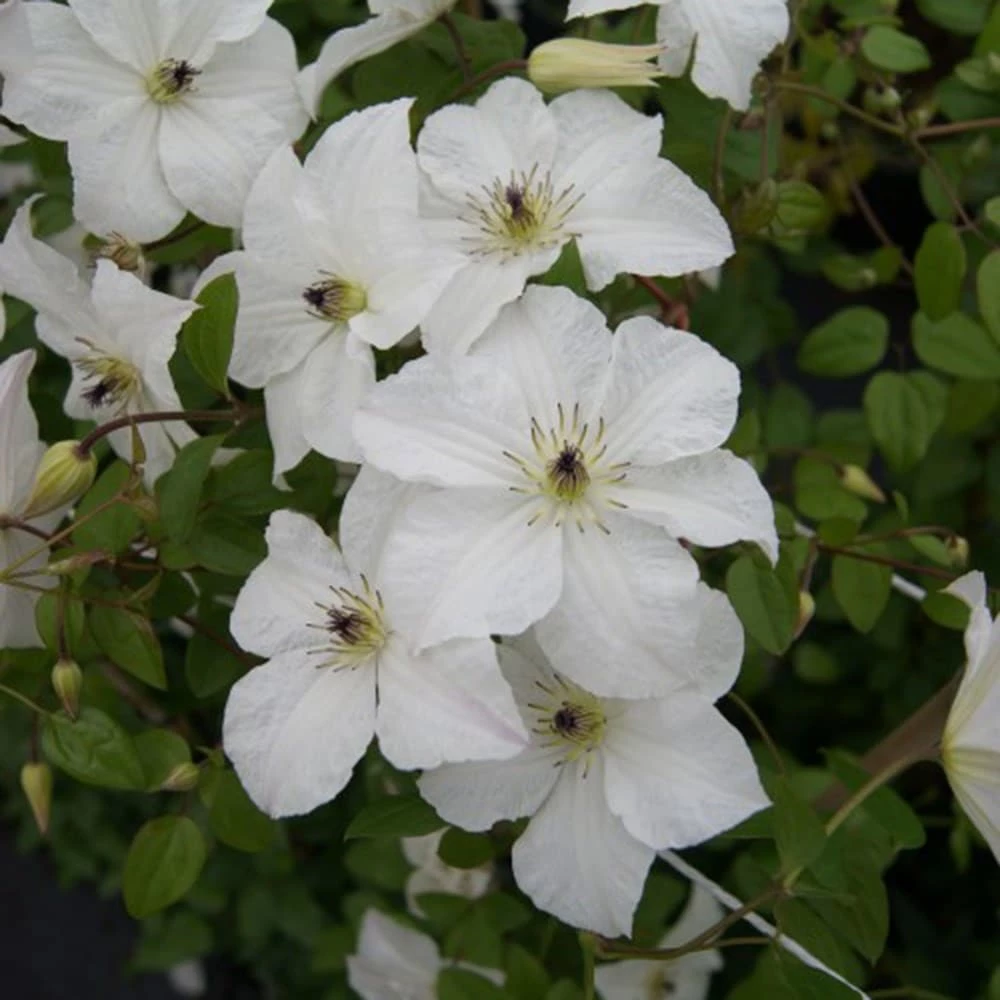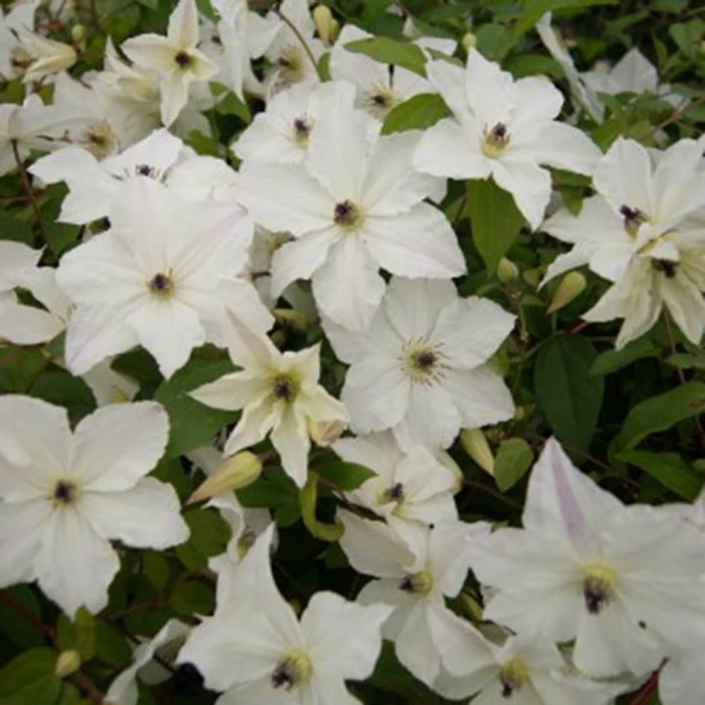 Producing its star-shaped flowers in abundance, and over a long period in summer, this new clematis will look great in a large pot. Alternatively, as it’s fast-growing, you can use it to provide summer cover on an ugly wall or fence. The flowers themselves have a satiny texture to their petals, which are mainly white, but often with a pink or purple blush.