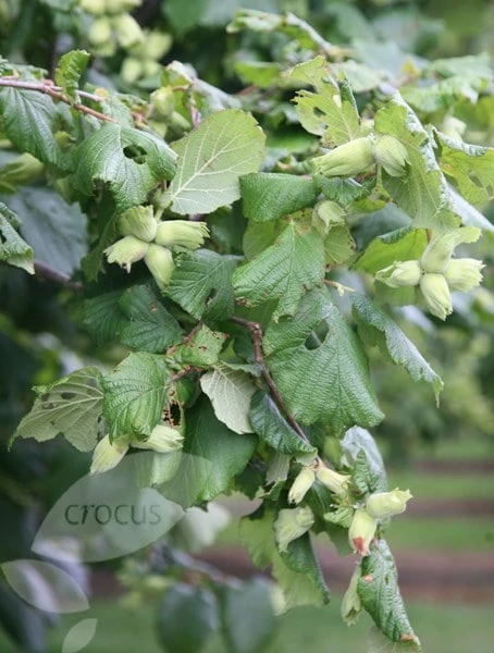 A self-fertile hazelnut, ‘Kentish Cob’ is widely considered to be the superior UK variety and easiest to grow in the garden. This attractive, tree-like shrub produces a mass of yellow-green catkins in the early spring followed by mid-green, heart-shaped leaves. A heavy crop of cobnuts from September occurs where there is enough sun and shelter to ripen the delicious, edible nuts.