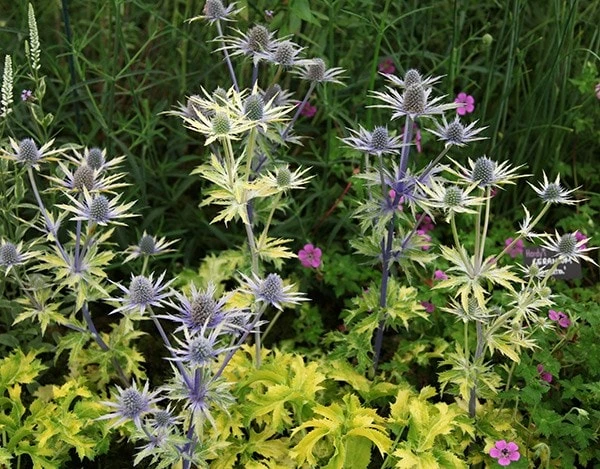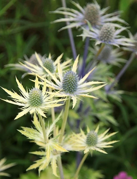 Thistle-like cones of bright blue flowers are surrounded by a ruff of spiky bracts, which turn from silvery blue at their base to gold at their tips. These form on blue stems that are clothed with yellow foliage, so the overall effect is quite colourful. This is a sun-loving plant that can be used in herbaceous borders or prairie-style planting schemes. The flowerheads are long-lasting and can be dried and added to arrangements.