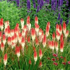 ‘Orange Vanilla Popsicle’ is a cosy and compact Kniphofia ideal for small gardens and patio pots. Unlike older varieties of poker, this variety has delightful grassy foliage that remains tidy, so does not spoil the display. Initially deep red, the buds become paler before they open, while the flowers continue to fade to near-white as they mature. This creates a markedly two-tone effect on each flower spike.