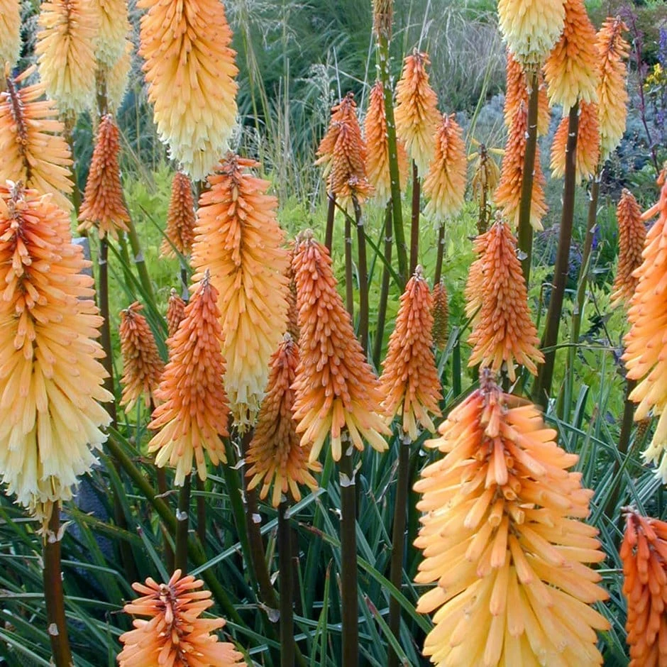 Tall bright and imposing, kniphofias lend height, vibrancy and drama to any garden. ‘Tawny King’ produces fantastic ‘pokers’ with dark bronze stems and tubular, cream flowers that open progressively from the base of the flowerhead above clumps of evergreen, strap-like leaves. The flowers start opening in July from apricot buds and continue to flower well into October. Originally from South Africa, the elegant, torch-like flowers of kniphofia make vertical accents in a sunny border and look particularly good as an exotic scheme based on ‘hot’ colours. They also look great with a background of ornamental grasses. This is an easy and undemanding plant.