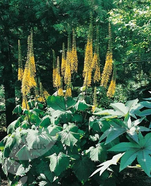 Slender spikes of brilliant yellow flowers on dramatic black stems zoom above large, handsome, boldly toothed leaves in July and August. This towering deciduous perennial makes a striking specimen plant for a moist, sunny border or bog garden. Or try it beside water, and make sure it has protection from the strong, midday sun.