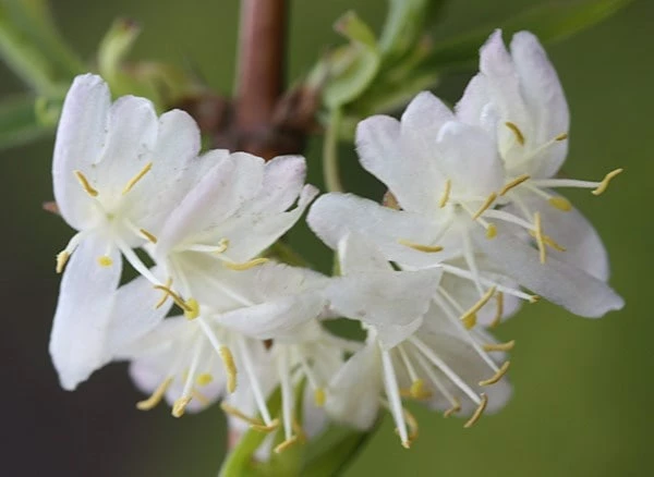 Clusters of white, tubular flowers with prominent yellow anthers cling to bare branches in the depths of winter and fill the air with a heady fragrance. The scent from this deciduous or semi-evergreen shrub will stop you in your tracks. An invaluable addition to the garden in winter, it is best planted near a path or in a front garden, where its delicious fragrance can be appreciated. Once the bright green leaves appear, this honeysuckle looks rather insignificant, so plant it among shrubs that provide interest over the summer months.