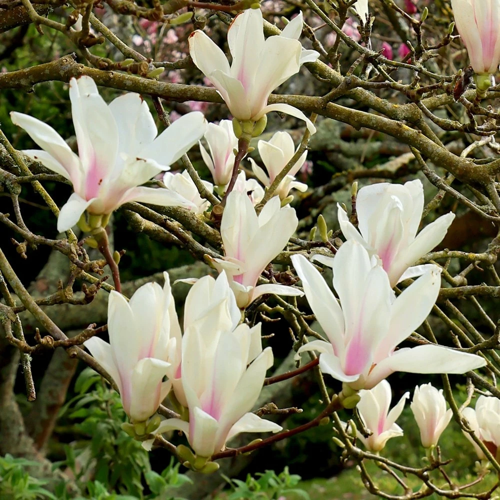 One of the most popular magnolias, with large, dark green leaves that start to appear in mid spring, at about the same time as the huge pure white, goblet-shaped flowers, which are flushed purple-pink at the base. This is an excellent magnolia for smaller gardens, as it remains a shapely shrub for many years, and even when it is mature, is a manageable small tree.