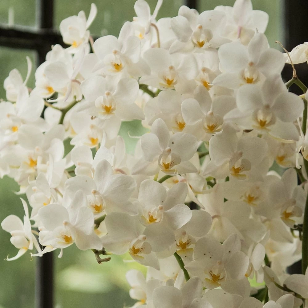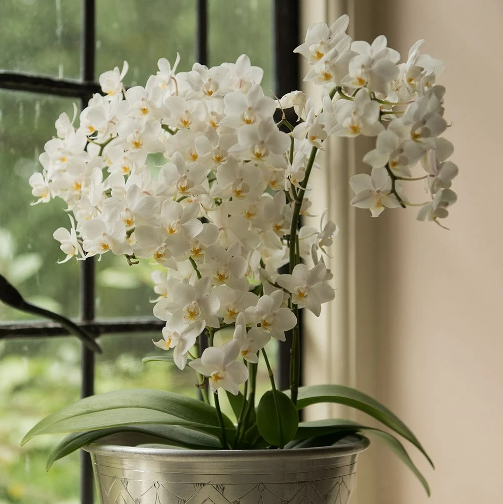 The flowers of this orchid may be small, but there are loads of them (we lost count!), so the overall effect is really impressive. What’s also impressive is the length of time the flowers last – we had one in the office last year that flowered non-stop for virtually the whole year. They are relatively easy to grow – ours did not get too much TLC, and even got neglected at times, but it still soldiered on pumping out the flowers regardless. If you give it as a gift the recipient will be thrilled! Please note that the pot in the photograph is not supplied with the plant (which is sent out in a simple nursery pot). They do however make excellent potted plants, and if you want to have a ‘finished’ look, we do have a wide range of pots on our website to choose from.