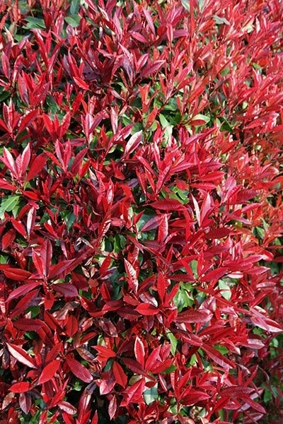 With its parrot-red, glossy young foliage, and large, rounded heads of ivory flowers, this versatile evergreen shrub is deservedly popular. It colours up best in full sun, and will usually only flower in sunny conditions, although it makes a handsome background evergreen shrub in partial shade, too. It can cope with hard pruning, so can be trimmed to form an informal hedge or clipped into strong shapes. The flowers appear in mid and late spring, and are sometimes followed by spherical red fruit. In frost-prone areas, train as a wall shrub against a south or west-facing wall.