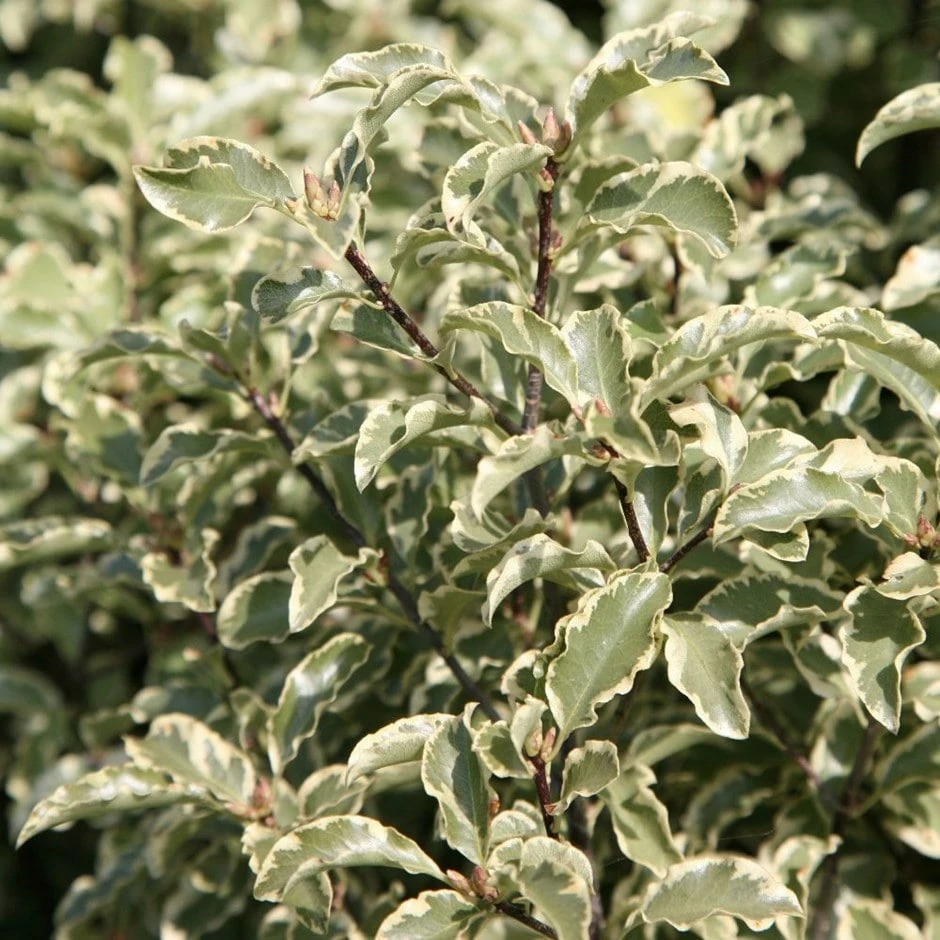 Prized for its striking, dark grey or black young stems clothed with distinctive, wavy, small grey-green leaves edged with cream, this large, bushy, evergreen shrub or small tree forms a natural oval. It makes a lovely backdrop to a sunny, well-drained border and responds well to light clipping into a more formal shape. An excellent plant for warm coastal areas, where it can successfully be grown as an attractive, variegated windbreak or hedge.