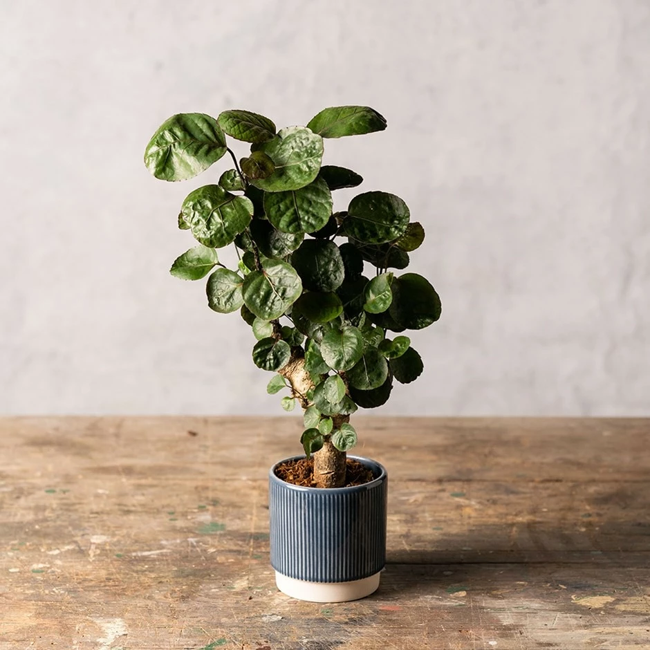A characterful, upright and compact tree, its gnarly stem supports large, glossy, deeply-veined, scalloped, emerald-green leaves tinged purple underneath. ‘Fabian’ is a superb indoor plant that makes a real statement and taking point – and it’s said the leaves and roots can be used as antiseptic and deodorant!
