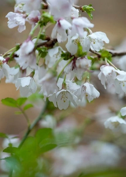 This is a pretty, delicate-looking, deciduous shrub with wiry twigs that burst into life in late winter and early spring when the crimson buds open to display pale pink flowers. The young leaves are long and pale green, growing darker with age, and turning glorious shades of red and orange in autumn. It has a compact, rounded shape and a gently spreading habit, which makes it an excellent shrub for small gardens, or for a Japanese-style garden.