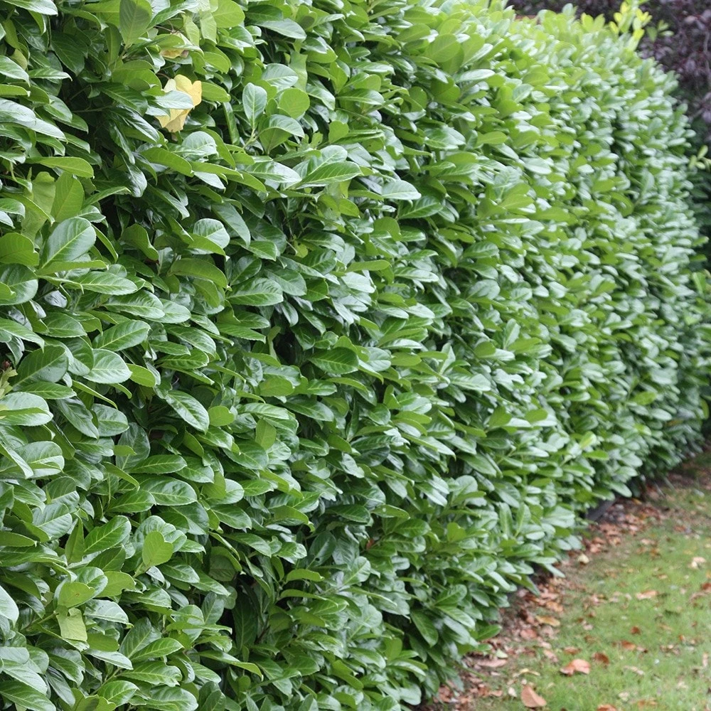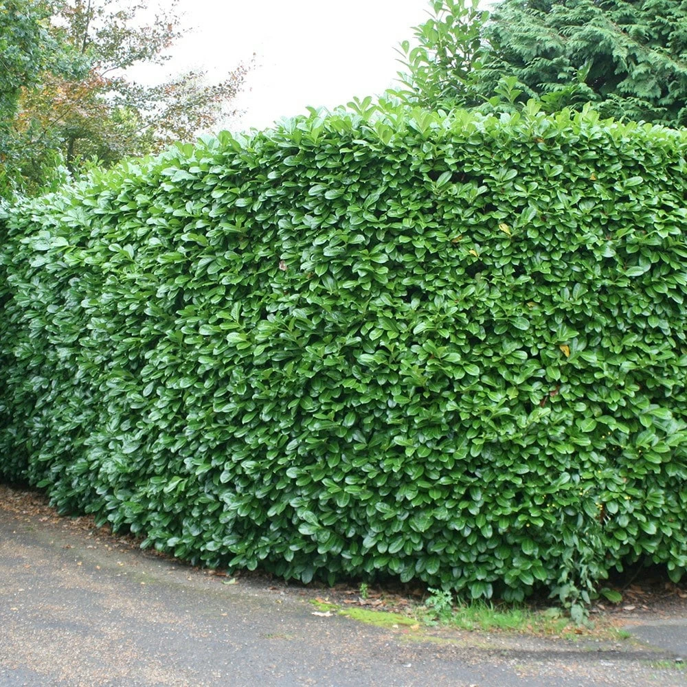 Dense, bushy, evergreen shrub with large glossy, dark green leaves. It makes an excellent hedging plant, and can cope with deep shade under trees as well as full sun. Small white flowers are produced on spikes in mid- spring, followed by cherry red berries which are harmful if eaten. ‘Rotundifolia’ will make a dense evergreen screen or hedge if lightly clipped to maturity and is a robust plant for exposed sites where privacy and shelter are paramount.
