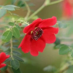 Scented, single, cream-centred, cherry-red flowers in May and June, and dainty, mid- to dark green leaves. This vigorous species rose is perfect for sunny, less informal areas of the garden. Although it only flowers once, its spectacular, flagon-shaped, orange-red hips provide autumn interest.