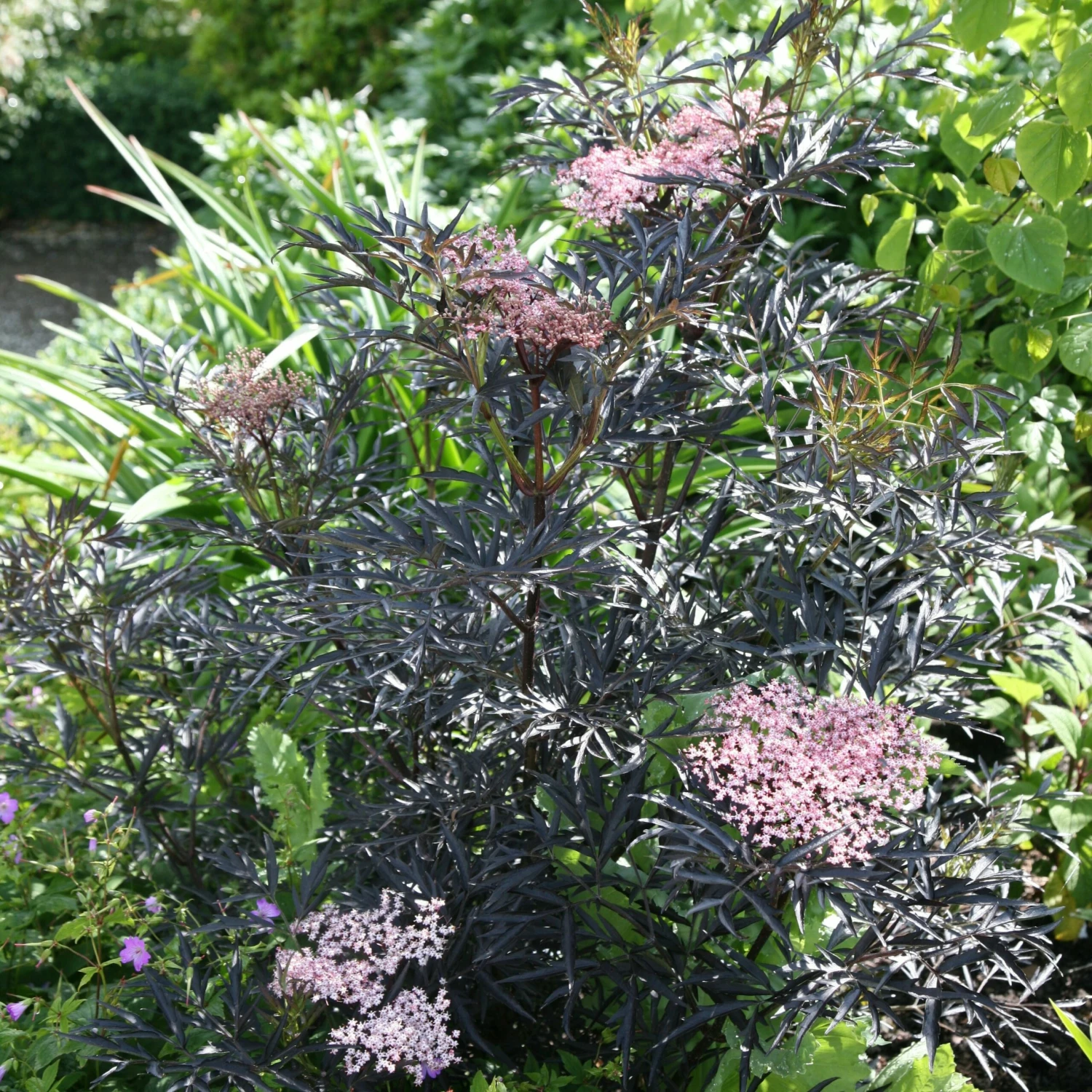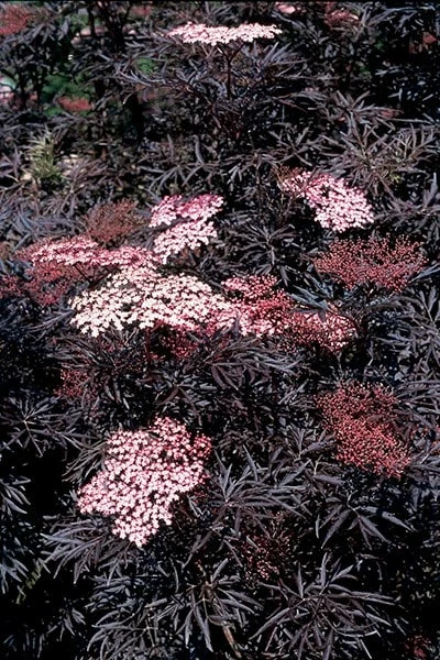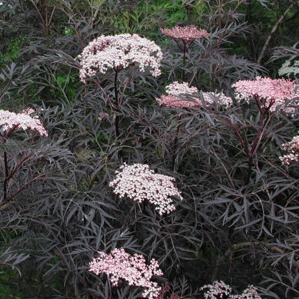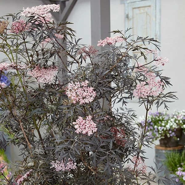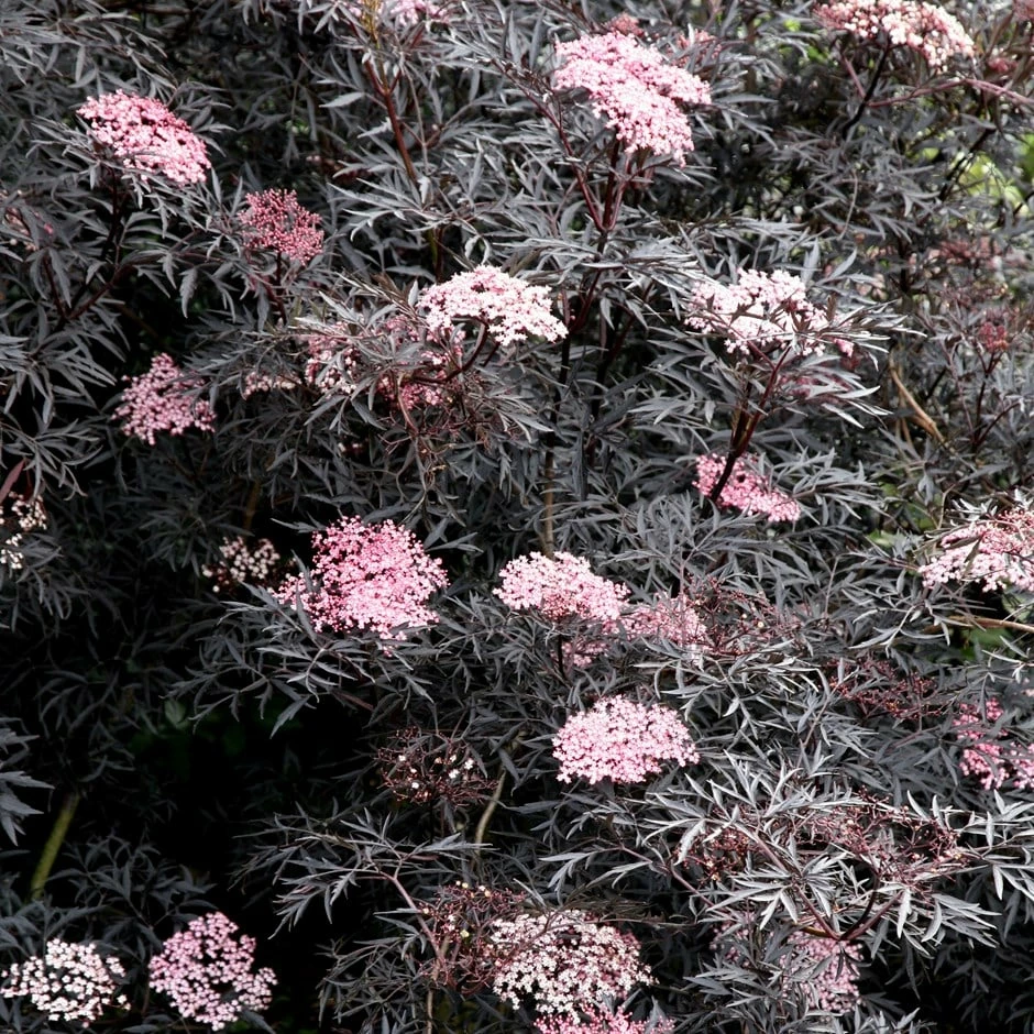 Striking almost black, dissected foliage and from May to June pale pink, musk-scented blooms emerge from beautiful creamy-pink buds. It makes an excellent shrub for all styles of gardens and has the added bonus of having blackish-red berries in autumn which are attractive to birds and when ripe can be used to make a wonderful wine. For best foliage colour grow it in full sun, otherwise it can fade to a greenish-bronze.