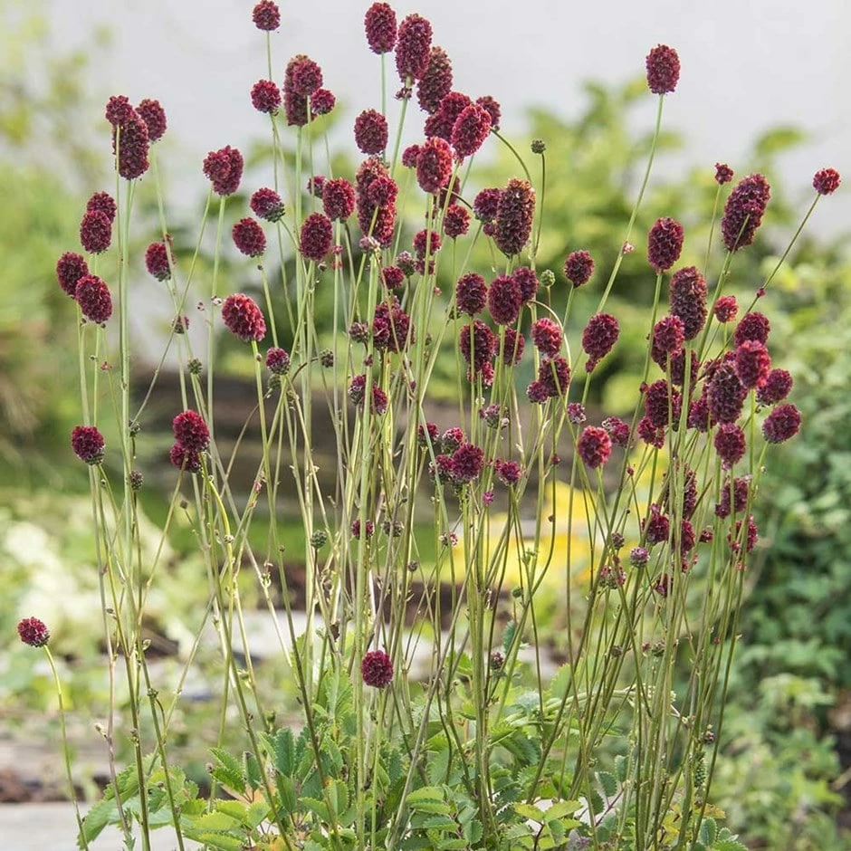 Erect stems bear densely packed, dark red flowerheads with red pink stamens in midsummer. They seem to hover in large numbers above the decorative mounds of attractive, fern-like foliage. ‘Proud Mary’ is great for adding vertical interest and movement to a mixed herbaceous bed, or mixing with ornamental grasses for a naturalised effect.
