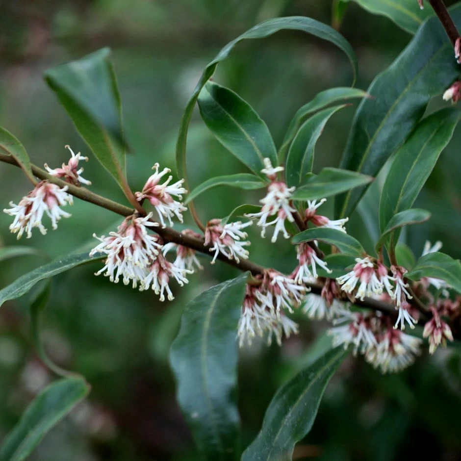 Clusters of small, creamy-white, tassel-like flowers and slender, mid- to dark green leaves. This compact, thicket-forming shrub is perfect for planting below a window, close to an entrance or path. Excellent evergreen groundcover for a moist, shady spot, the unassuming flowers are deceptive – their vanilla-like scent is one of the headiest winter fragrances.