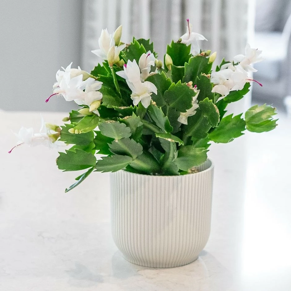 This easy to grow house plant will brighten up a bright windowsill or table with its long-lasting display of pink-flushed white flowers. Often referred to as the Christmas cactus, it is not unusual for it to be in bloom non-stop from November to the end of January – and even after it has finished flowering, its fleshy green foliage makes an attractive addition to the home. This plant will be delivered in bud/flower for instant colour.